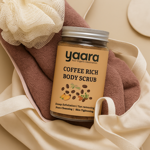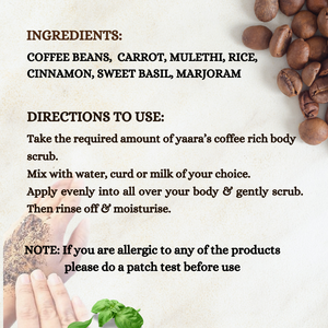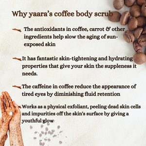 Scrub away dullness with Yaara's coffee rich body scrub made of freshly roasted coffee beans, carrot, chinnamon and many more. It tightens and refreshes your skin while fighting off everyday stress.