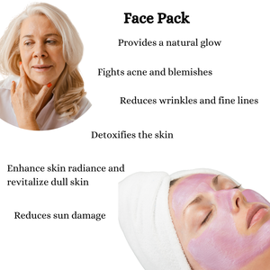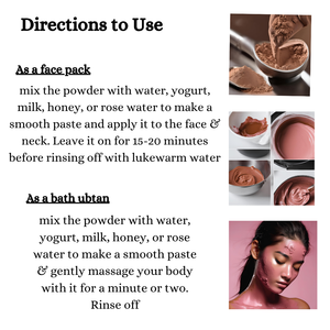 - 1 Face Pack: Mix the powder with water, yogurt, milk, honey or rose water to make a smooth paste and apply it to the face & neck. Leave it on for 15-20 minutes before rinsing off with lukewarm water.