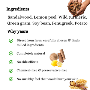Sandalwood, Lemon peel, Wild turmeric, Green gram, Soy bean, Fenugreek, Potato