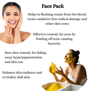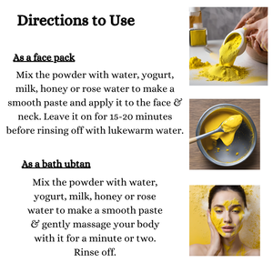 - 1 Face Pack: Mix the powder with water, yogurt, milk, honey or rose water to make a smooth paste and apply it to the face & neck. Leave it on for 15-20 minutes before rinsing off with lukewarm water.
