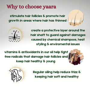 Fuel your hair roots with Yaara's hair growth oil powered by natural goodness which provides strong & healthy hair. Our oil gives you a frizz free, healthiest, more vibrant hair.