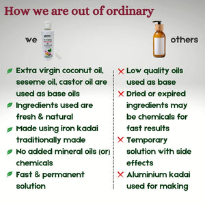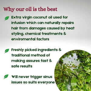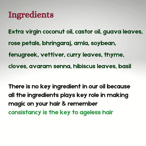 Extra virgin coconut oil, castor oil, guava leaves, rose petals, bhringaraj, amla, soybean, fenugreek, vettiver, curry leaves, thyme,